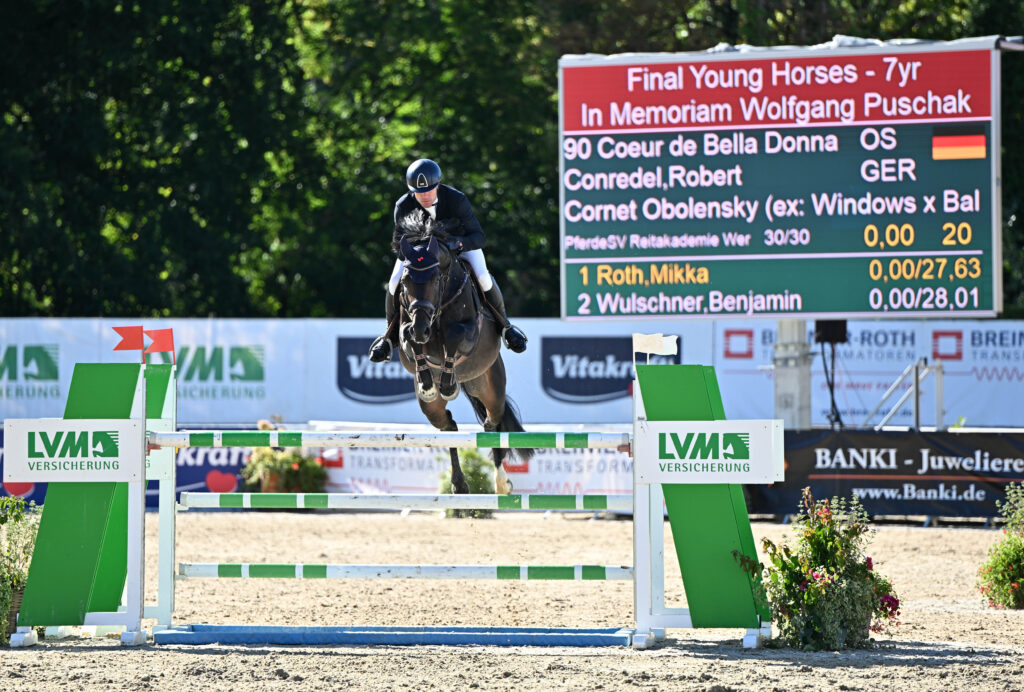 Coeur de Bella Donna is successful up to 1.40 m. He already thrilled with top placements in international Youngster Tours, such as CSI Herning/Denmark. He always performs with exceptional rounds and a brillant statistic of clear rounds. Coeur de Bella Donna presents himself always very careful on the jump and with an amazing elasticity. In 2021 Coeur de Bella Donna finished a very good 50-day test in Adelheidsdorf. Therewith, a lifelong registration in the stallion book (Hengstbuch I) is guaranteed.