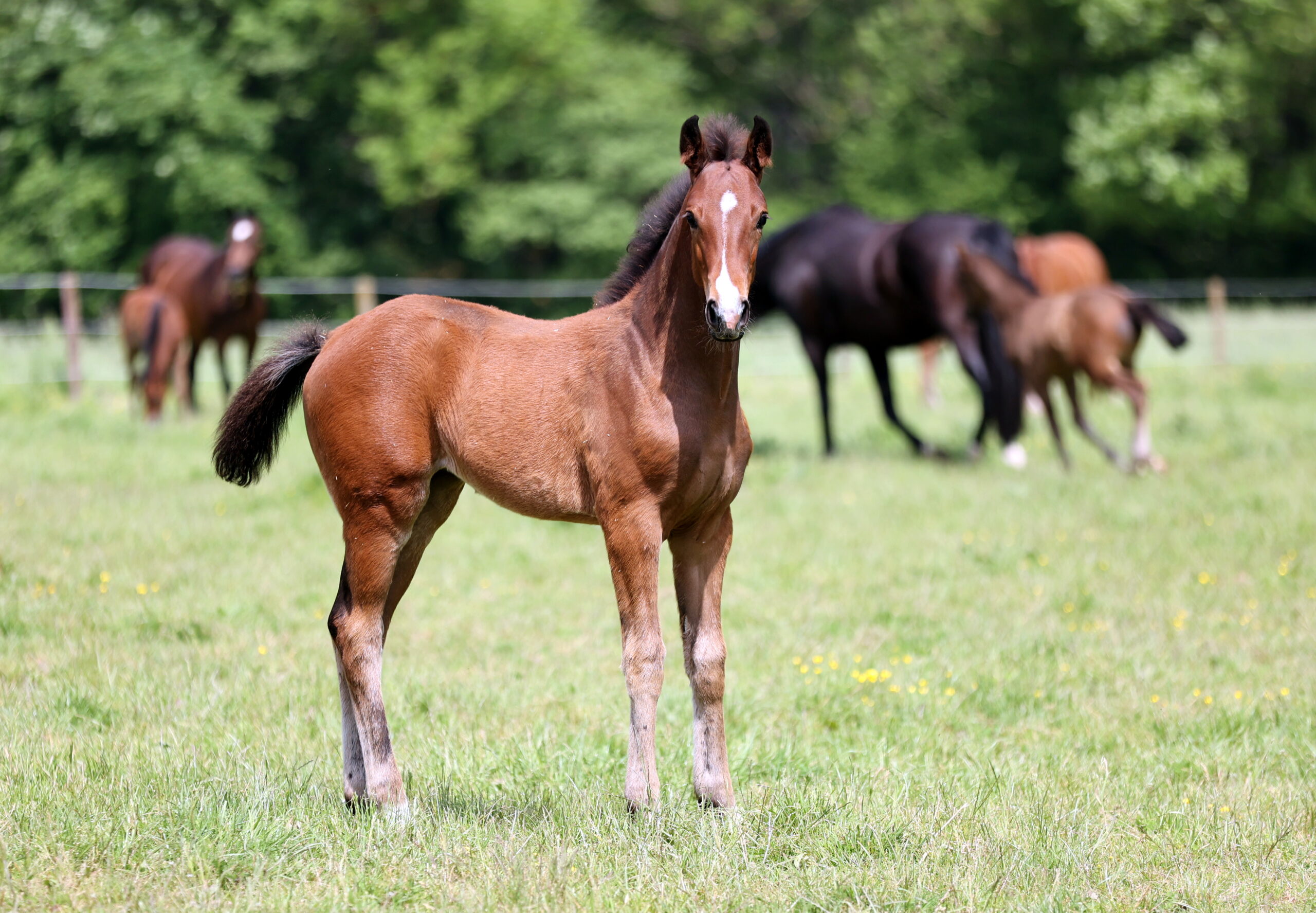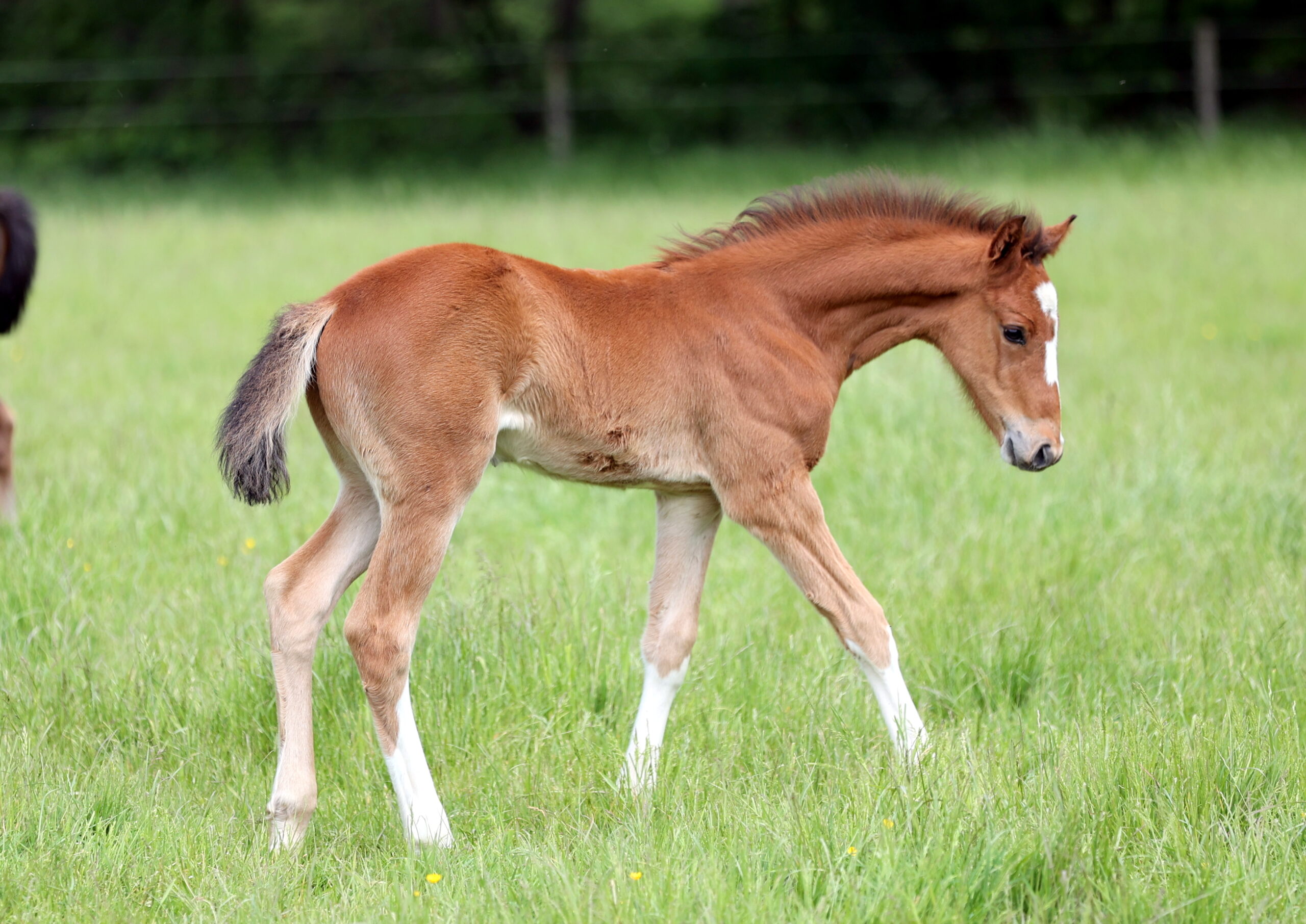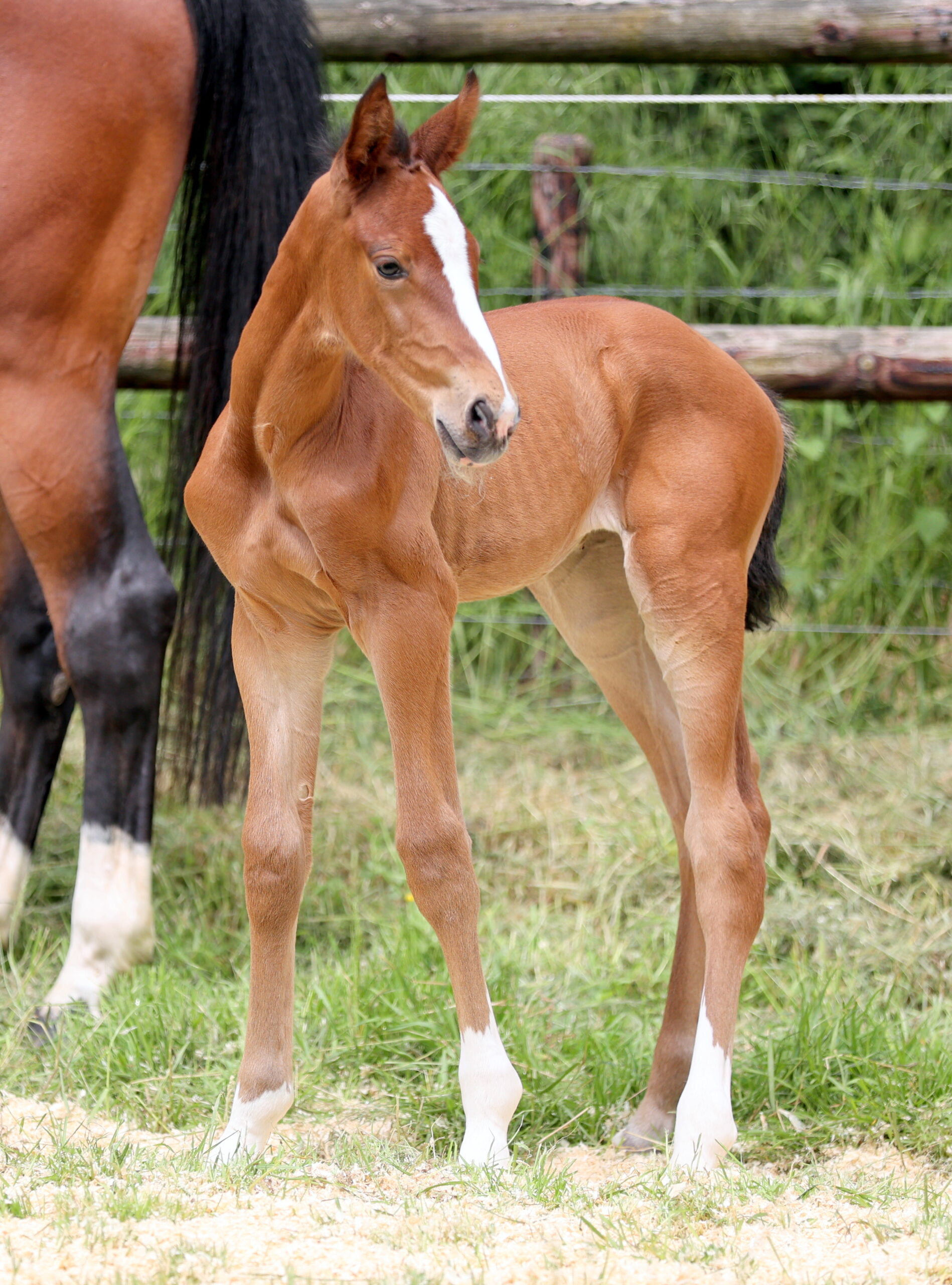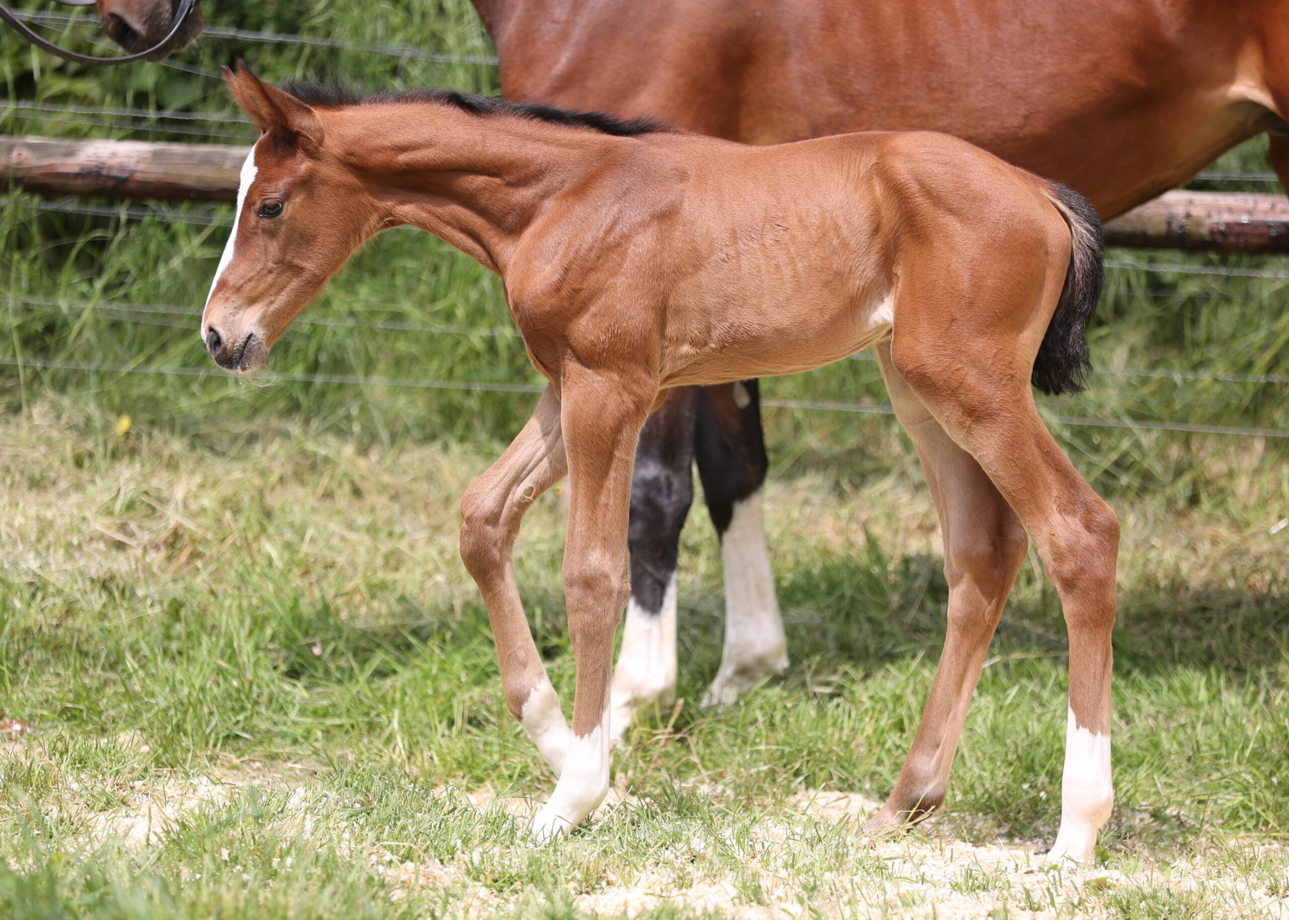 Large-framed and distinguished with a strong back and a type just like his famous fathers’, Nikan’s Diamond is simply bursting with strength. And this young athlete knows to implement this strength carefully and is always focussed in the jumping-course. With ease, this extremely scopey youngster overcomes any obstacle. Furthermore, Nikan’s Diamond is a real eye-catcher due to his beautiful liver chestnut coloured coat, the big blaze and stockings on all four legs.